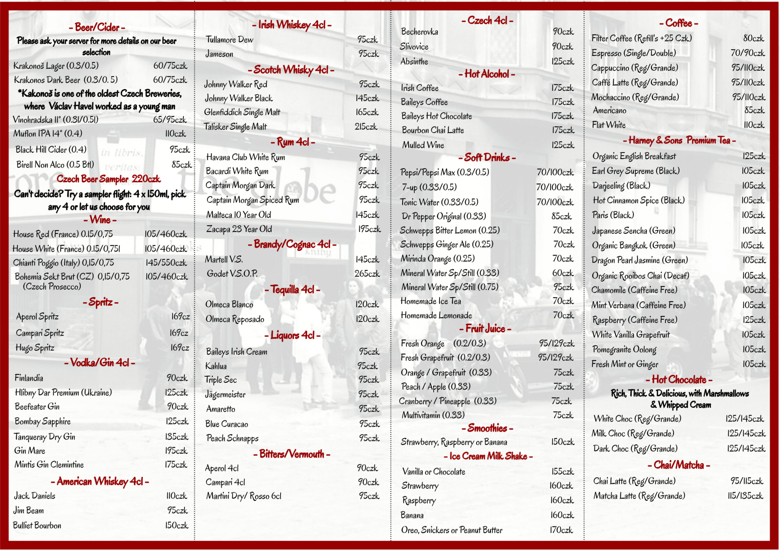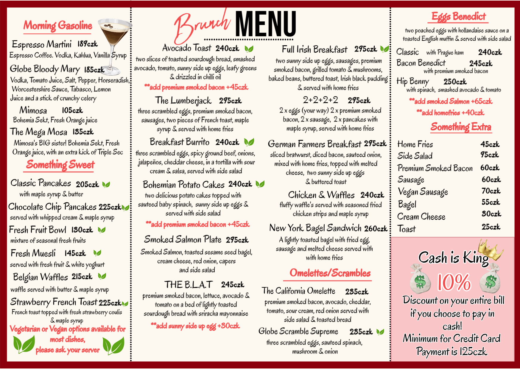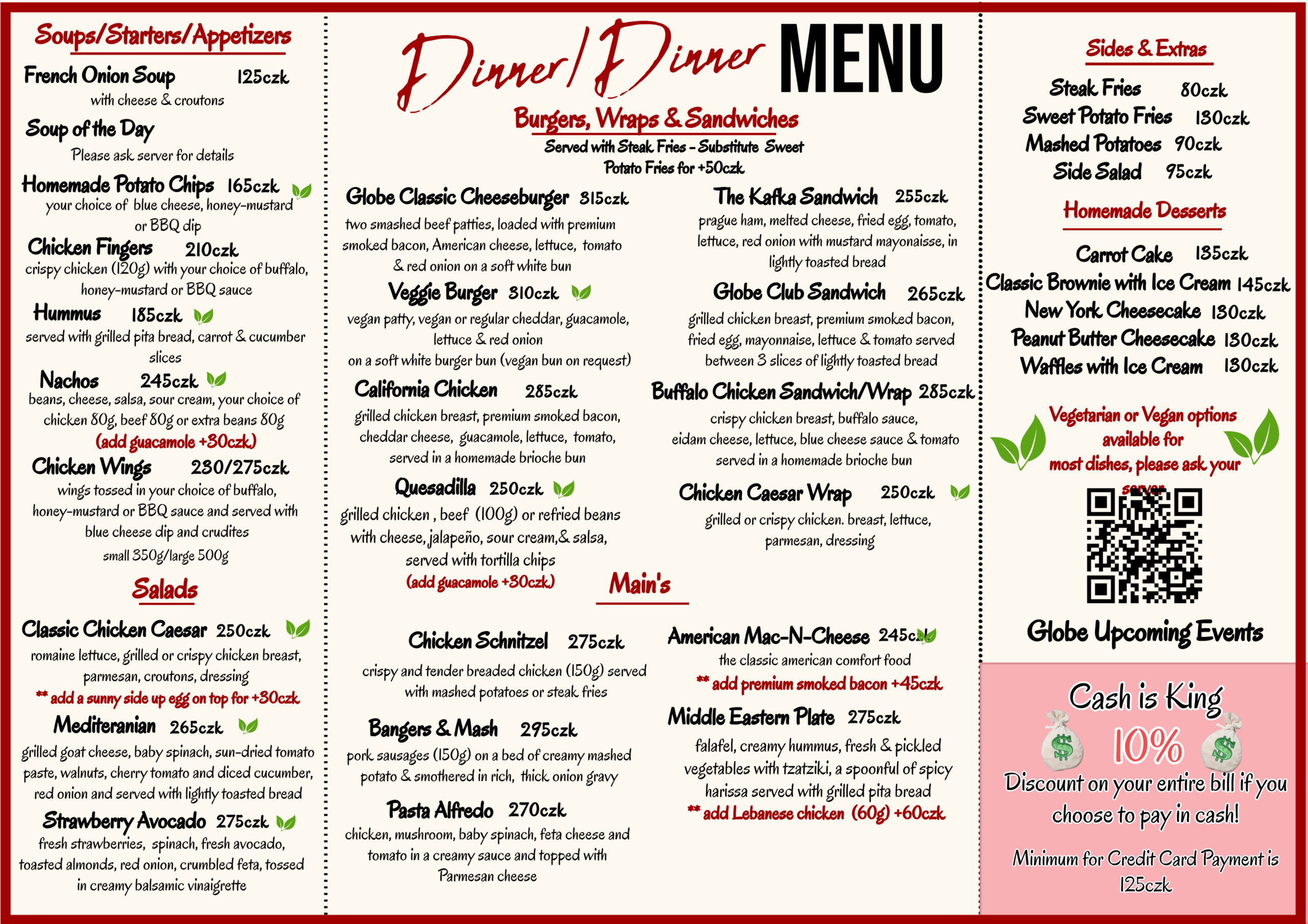 Our menu is American-influenced and provides our customers with a broad range of options, including many of their comfort food favorites, such as the best burgers and buffalo wings that you will find in the Czech Republic, while also introducing other exciting cosmopolitan and vegetarian dishes from around the world. We make all of our desserts in-house from scratch.